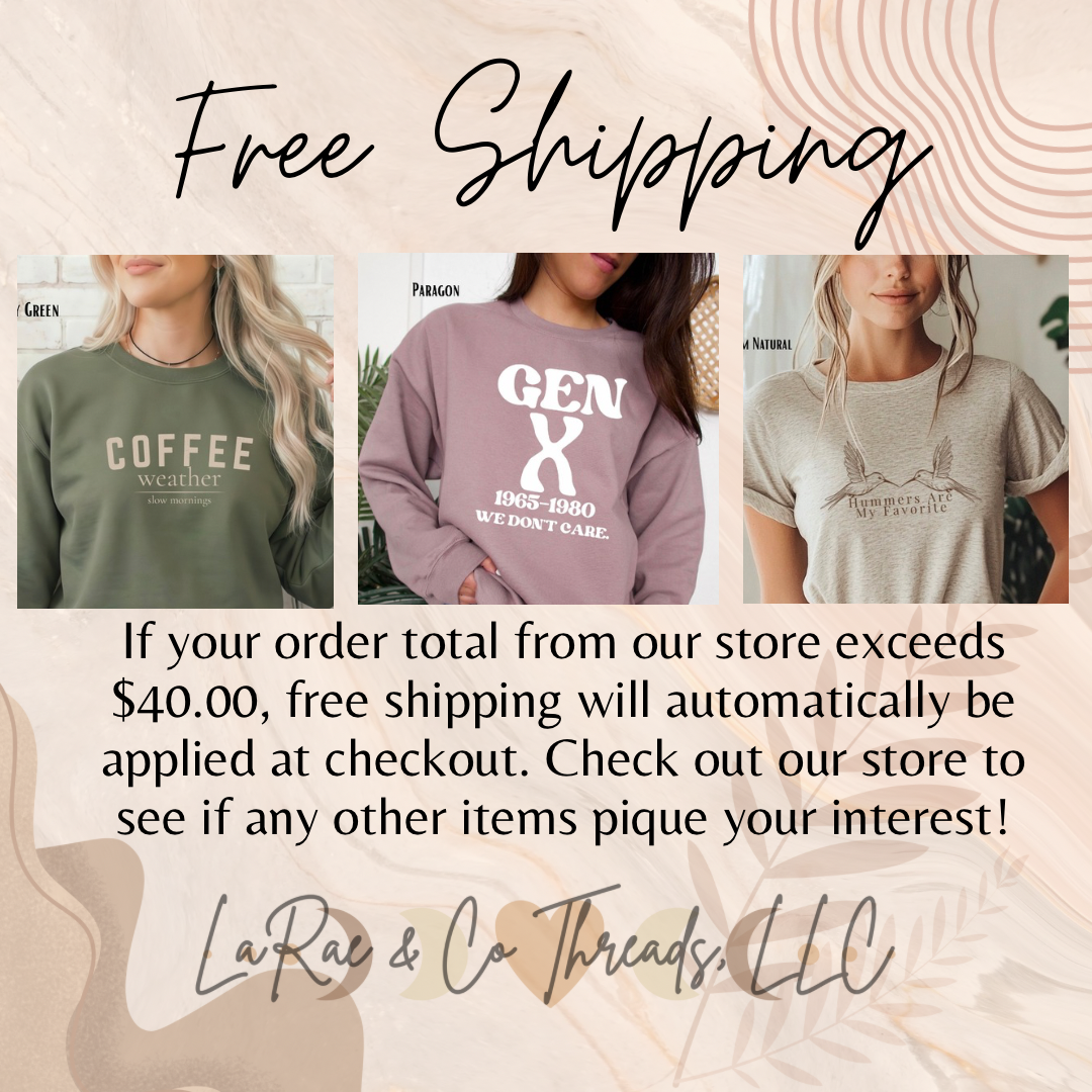 LaRae & Co Threads creates pieces that inspire, uplift, and celebrate individuality. My designs are made to help you express yourself, spread kindness, and wear your values confidently.